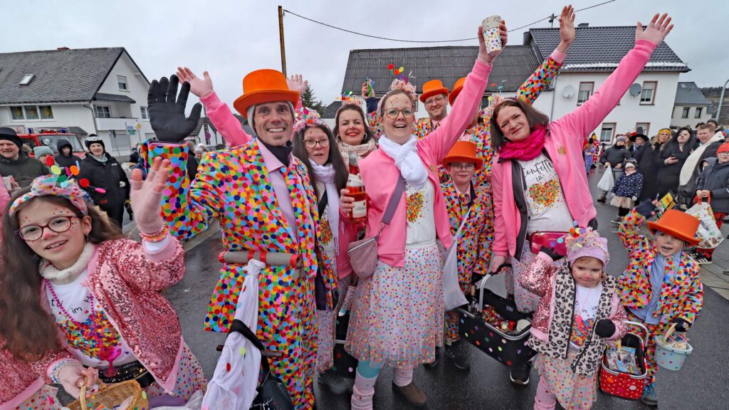 Beim Rosenmontagszug Müllenbach am Nürburgring feiert der Ort 60 Jahre Karnevalstradition